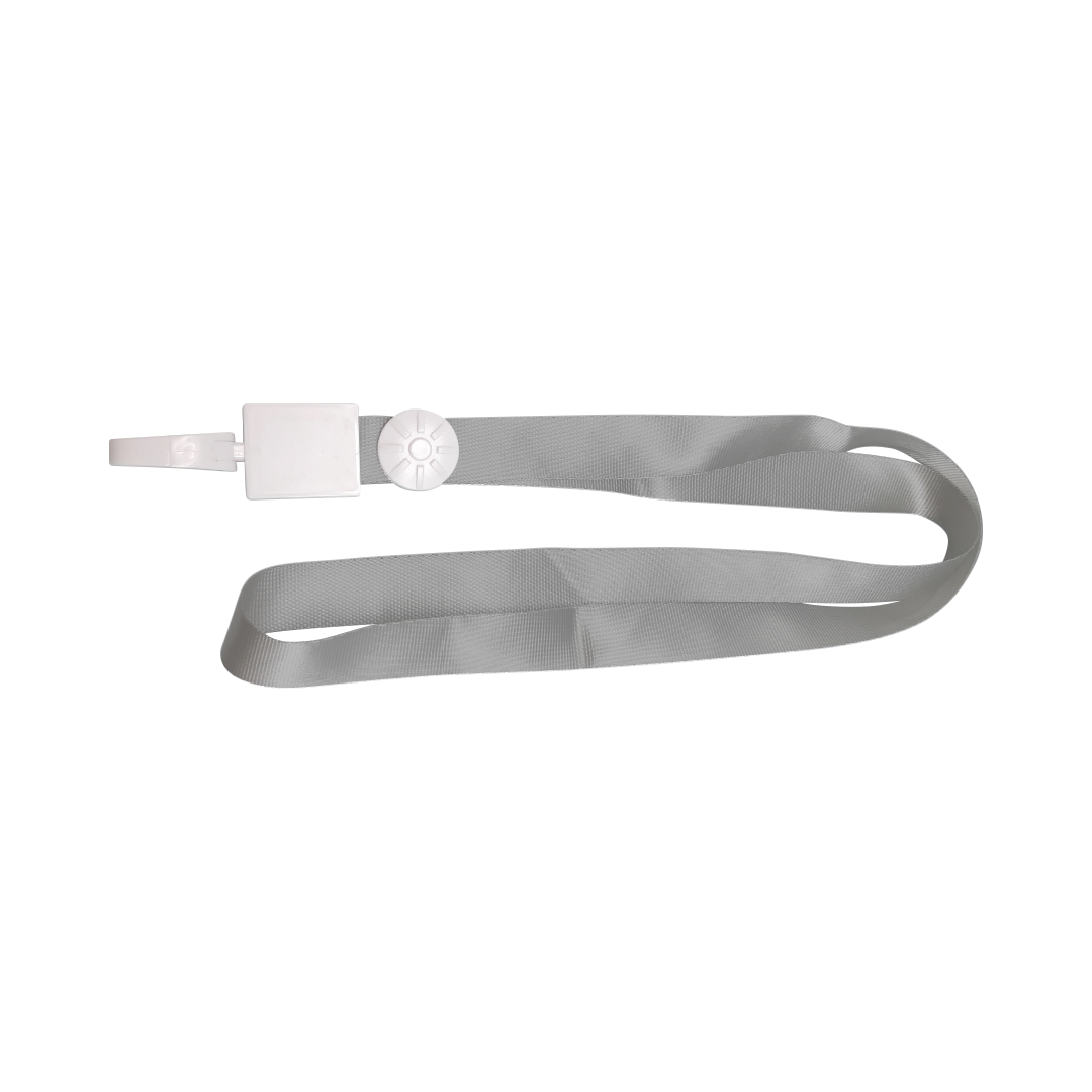 Táto šedá šnúrka na krk je vybavená plastovou karabínkou a doplnkom na nastavenie veľkosti. Oválna plastová karabína je podobná prémiovej kovovej karabíne. Regulátor veľkosti vám umožňuje nastaviť, do akej miery sa majú popruhy šnúrky na krk roztvoriť. Keďže šnúrky na krk sú vybavené plastovými doplnkami, ideálny môže byť aj pre osoby citlivé na kov.